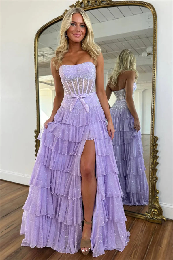 - Cute Sparkly Light Blue Chiffon Tiered A Line Strapless Long Prom Dresses, MP1101