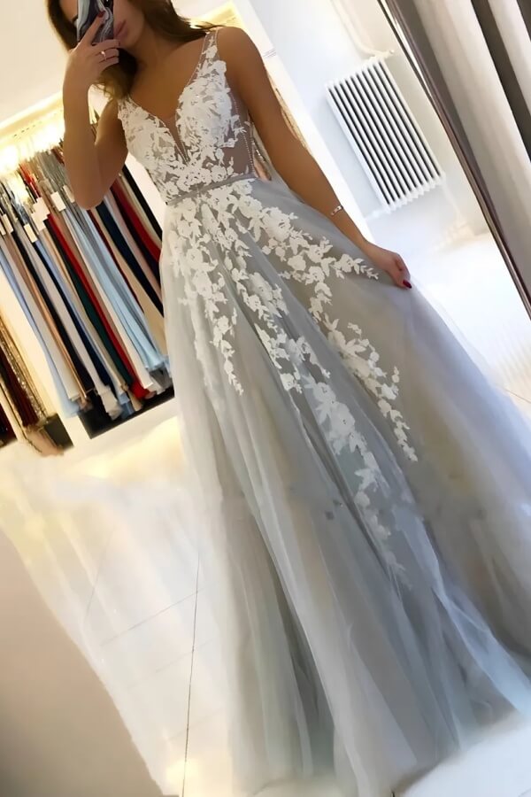 Silver Tulle A Line V Neck Classy Long Prom Dresses With Lace Appliques, MP1062