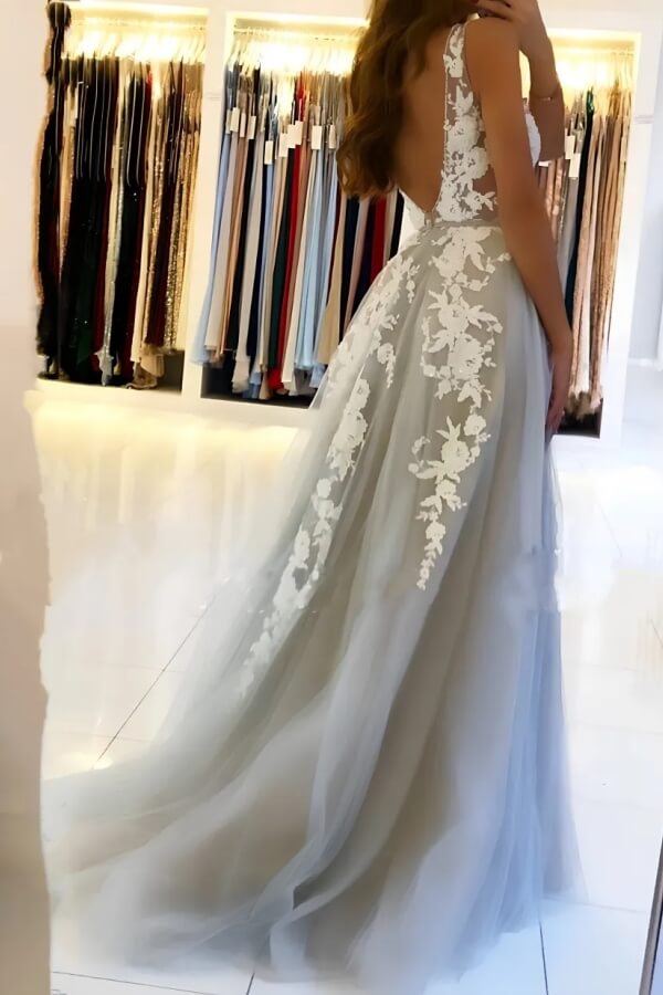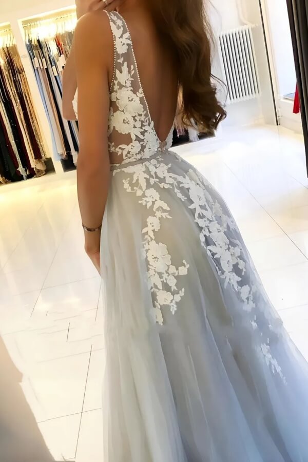 Silver Tulle A Line V Neck Classy Long Prom Dresses With Lace Appliques, MP1062 Silver Tulle A Line V Neck Classy Long Prom Dresses With Lace Appliques, MP1062