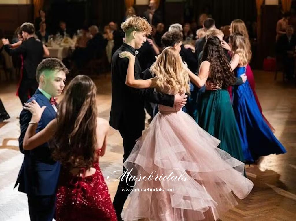 Sparkly Tiered Tulle A-line V-neck Long Prom Dresses, Evening Dresses, MP868