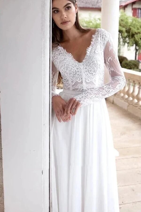 Romantic Chiffon Lace A Line Long Sleeves Wedding Dresses, Bridal Gown, MW1198