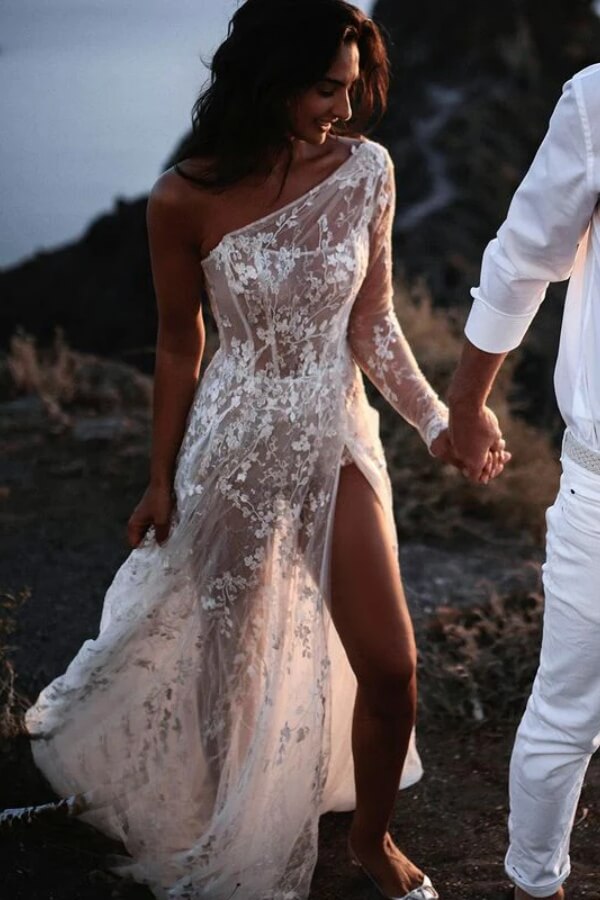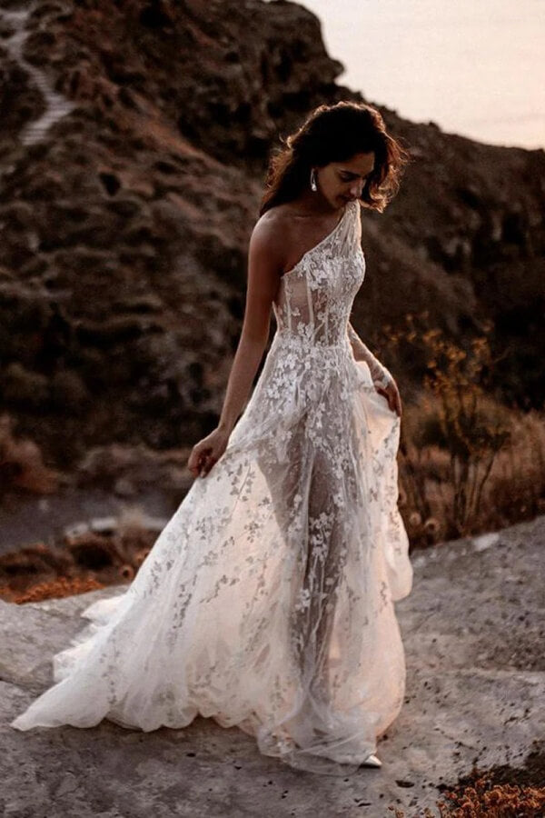 Tulle A Line One Shoulder See-through Lace Appliques Wedding Dresses, MW1197