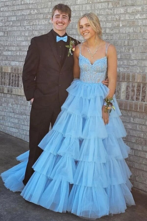 - Cute Lavender Tulle A Line V Neck Long Prom Dresses With Lace Appliques, MP1090