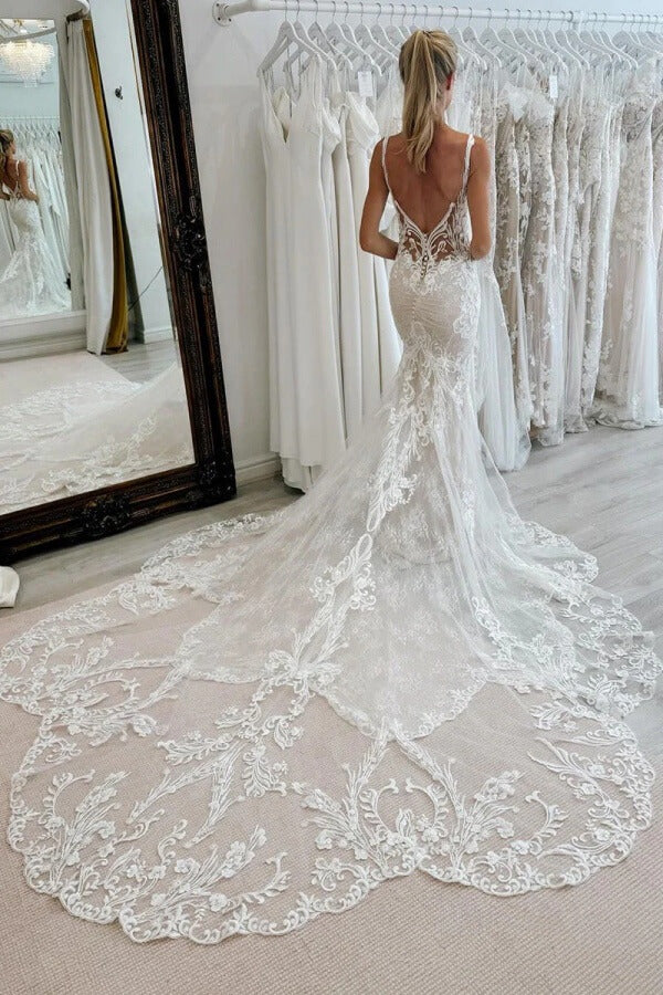 - Tulle Mermaid V Neck Spaghetti Strap Lace Appliques Wedding Dresses, MW1187